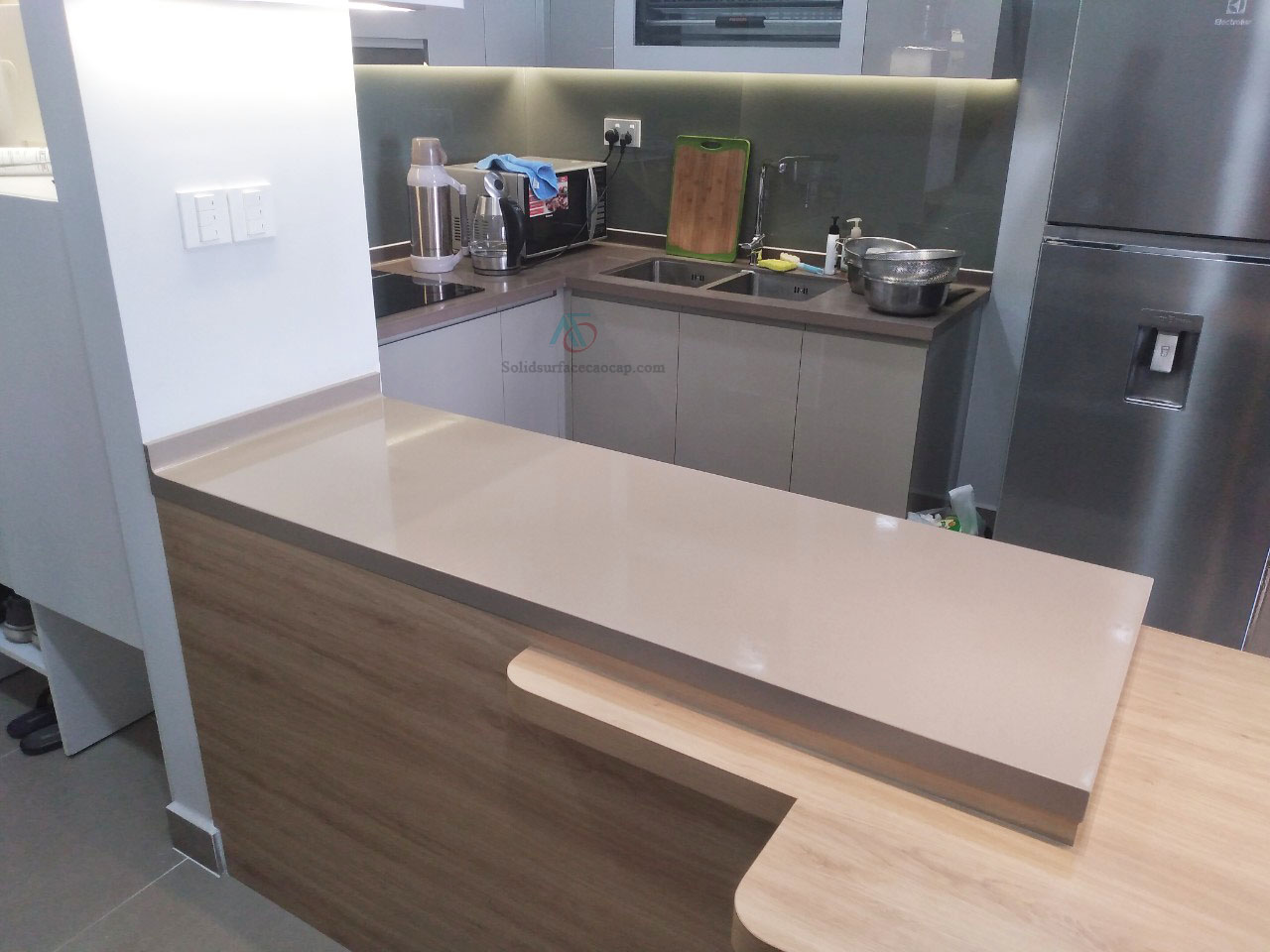 Đá Solid Surface được ứng dụng nhiều trong thiết kế nội thất trong nhà vừa bảo vệ tủ gỗ bởi các tác nhân như nước, bụi bẩn, nhiệt độ.