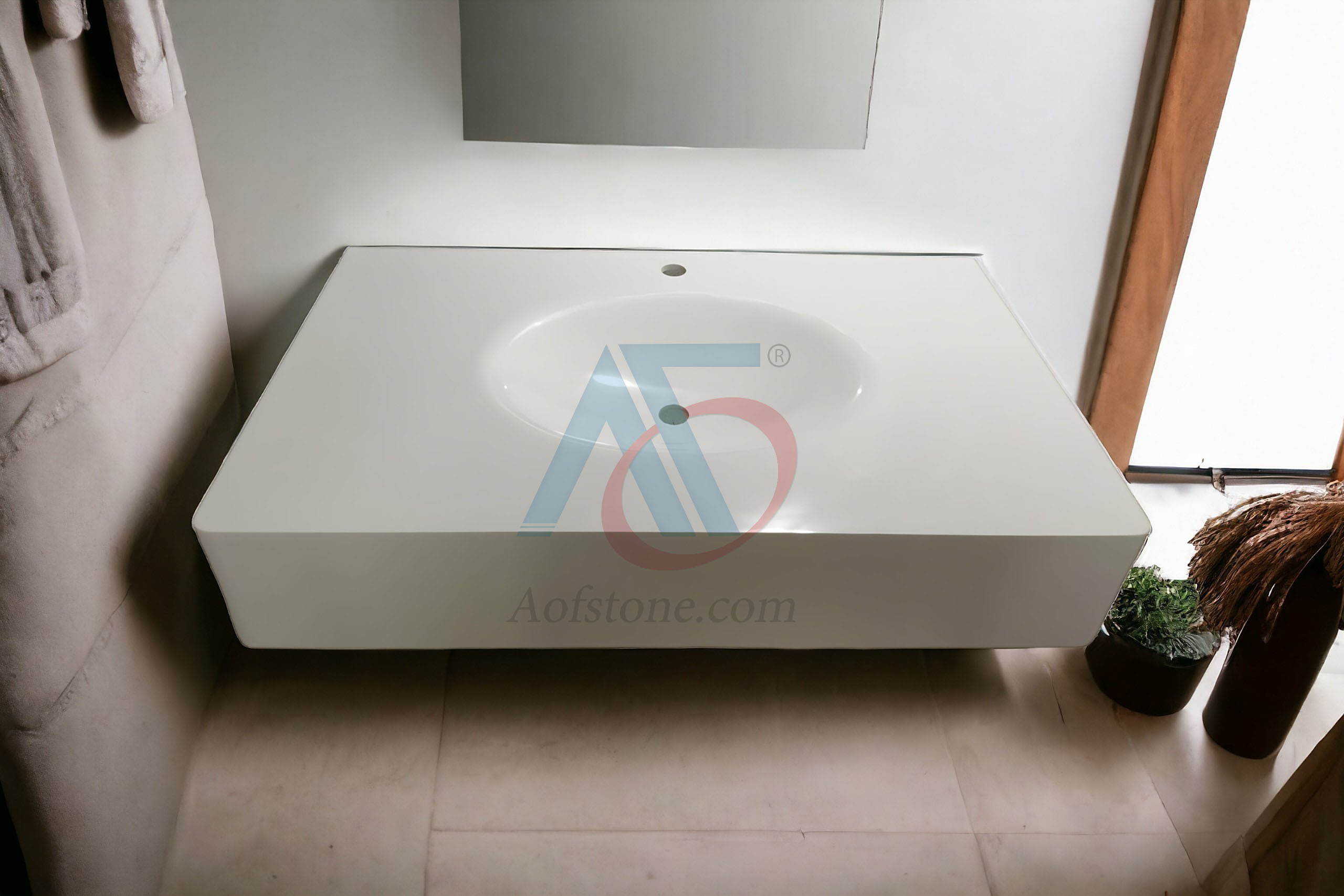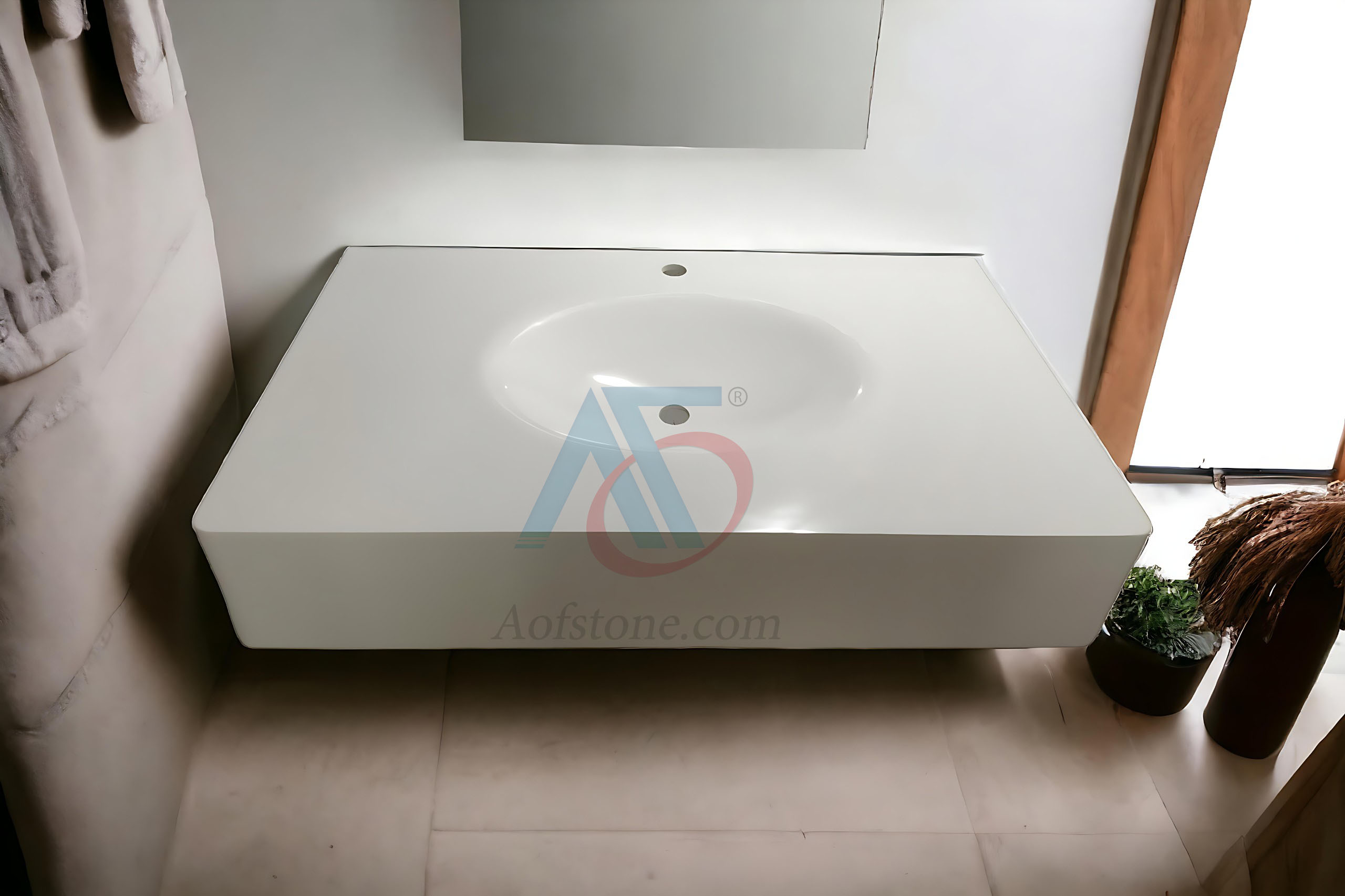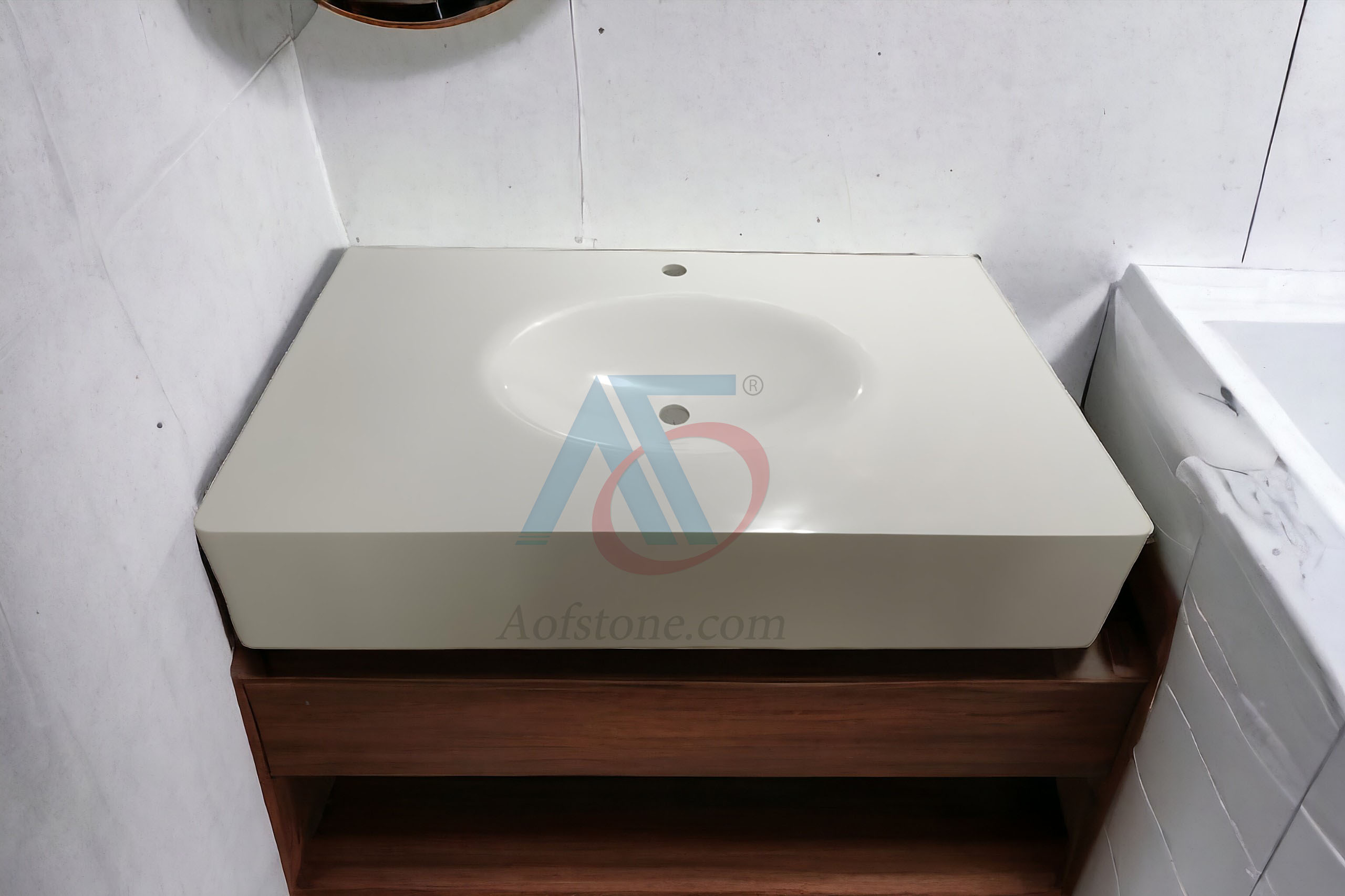 Mẫu chậu rửa mặt bằng đá Solid Surface đẹp âm bàn với thiết kế tiết kiệm diện tích thường được ứng dụng cho những không gian nhỏ. Ngay cả không gian nhà bếp, bạn cũng có thể lắp đặt loại chậu này dùng để vệ sinh các vật dụng. Mẫu chậu rửa mặt này thường được tích hợp với phần tủ hoặc ngăn kéo ở bên dưới. Phần mặt bàn rộng rãi nên bạn có thể để các đồ dùng cần thiết ở trên.
