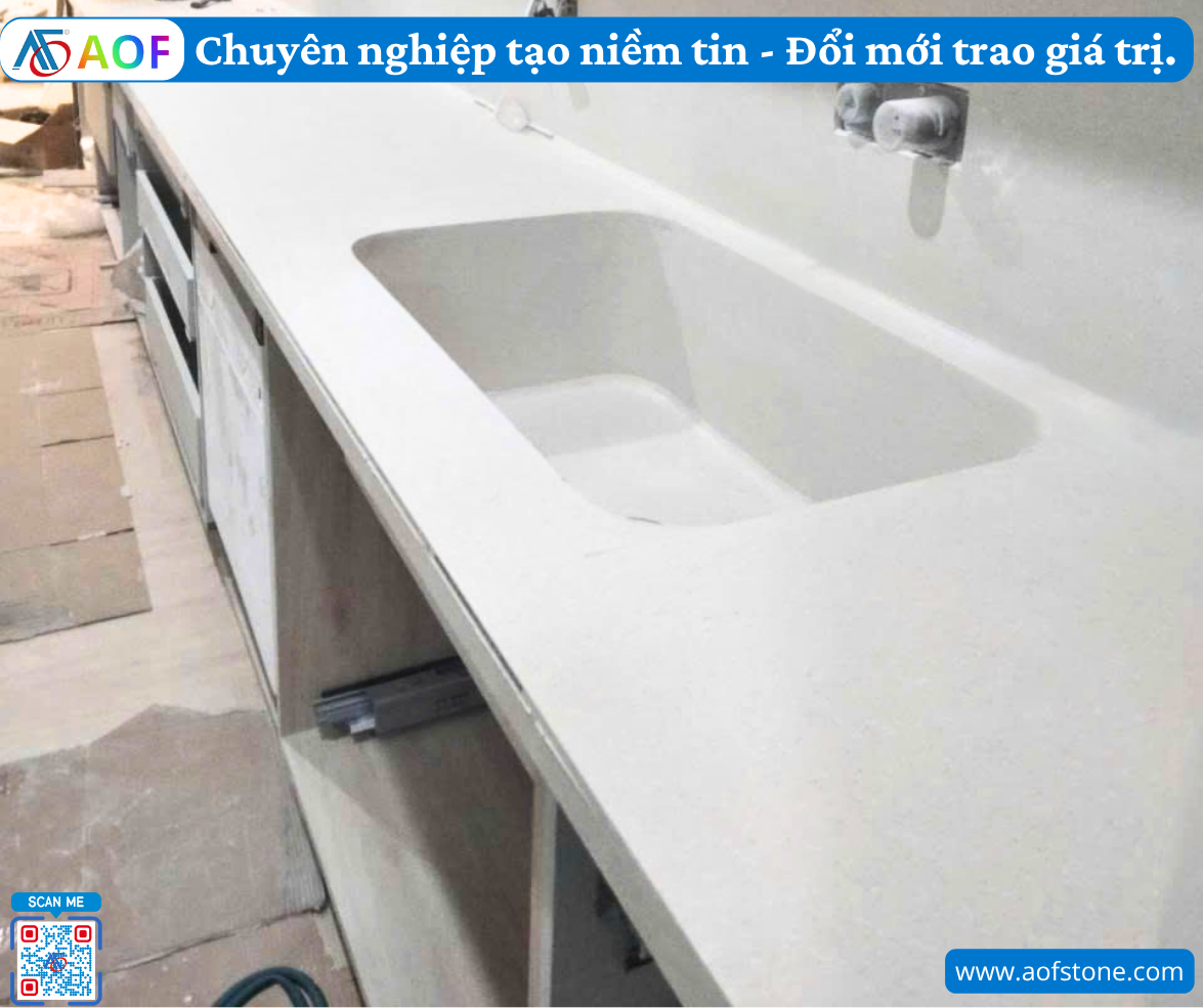 Chi phí vật liệu: Bao gồm giá tấm đá Solid Surface (tính theo mdài hoặc theo tấm), keo chuyên dụng để dán không mối nối, phụ kiện đi kèm như chậu rửa đúc liền, vòi nước, phụ kiện gia cố... Giá vật liệu có thể thay đổi theo thời điểm và nhà cung cấp.