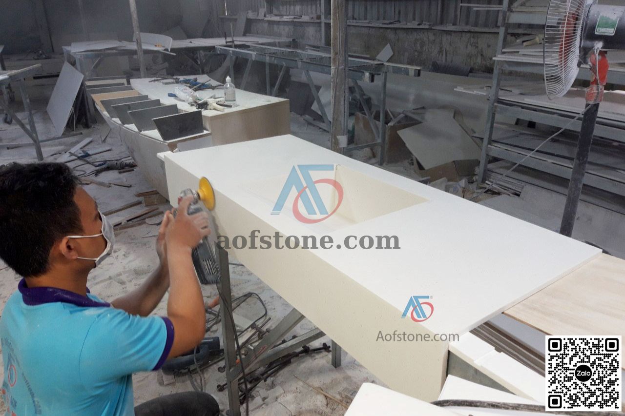 Nội thất AOF chuyên thi công hoàn thiện các sản phẩm về đá Solid Surface làm mặt đá lavabo, chậu rửa Lavabo, mặt bếp, bàn đảo, quầy lễ tân,bồn tắm,…Các sản phẩm về đá nhân tạo solid surface luôn được đảm bảo về chất lượng, màu sắc sang trọng, thi công nhanh chóng, bảo hành sản phẩm 5 năm.