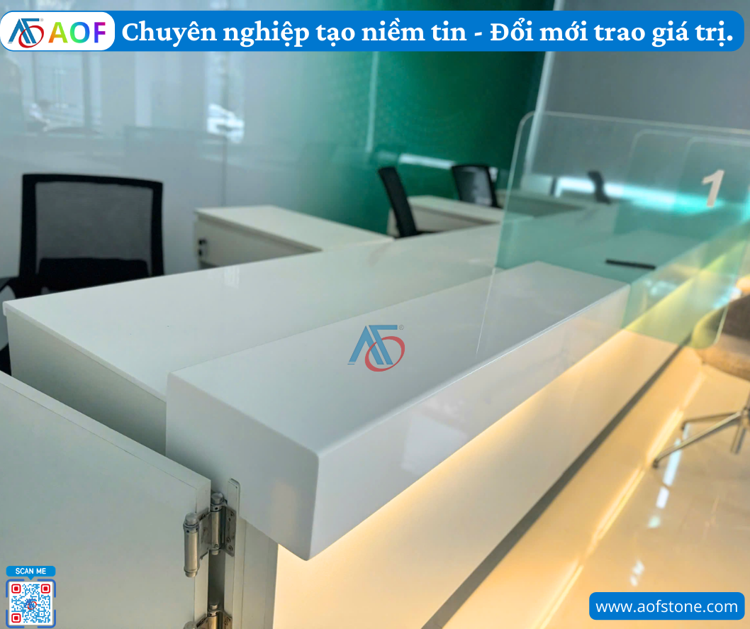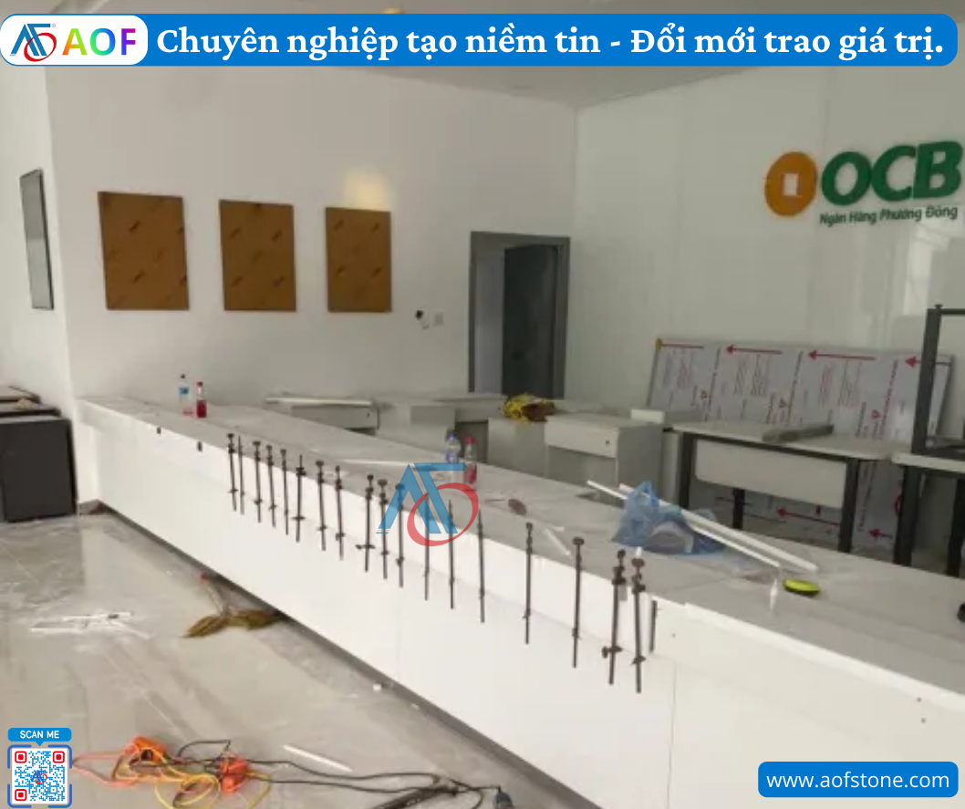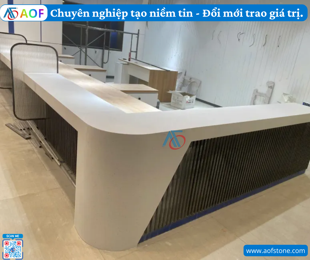 AOF hoàn thành thi công quầy giao dịch solid surface liền khối tại Quảng Ngãi. Khám phá quy trình thiết kế, thi công chuyên nghiệp và ưu điểm vật liệu Solid Surface.