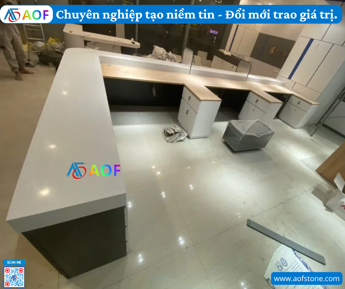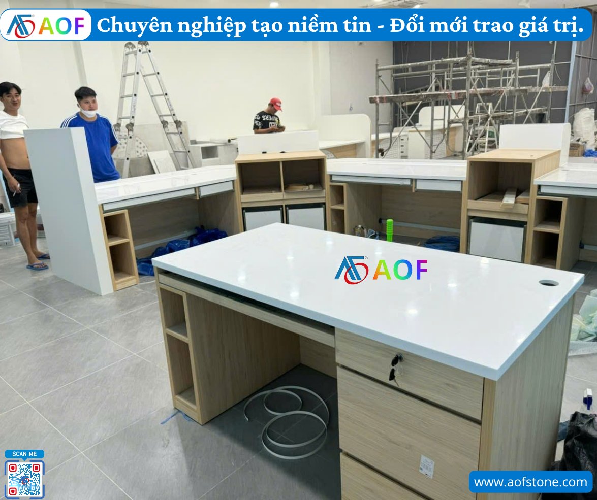 Để đảm bảo mẫu thiết kế quầy solid surface được thi công đúng cách, bạn cần chọn một đơn vị thi công có kinh nghiệm. Công ty AOF là một trong những lựa chọn tốt tại Nghệ An, chuyên cung cấp dịch vụ thiết kế và thi công quầy solid surface.